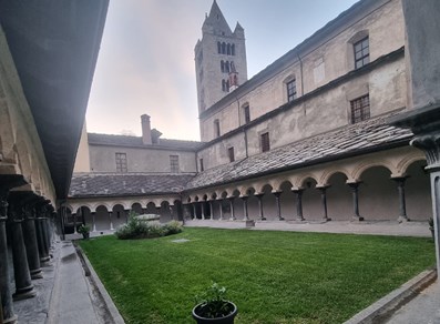 Il chiostro è il gioiello del complesso monumentale di Sant’Orso cui si accede da un androne aperto sulla destra della facciata. Il primitivo impianto romanico risale quasi certamente al 1132 e fu opera di maestranze provenzali o lombarde; quando la bolla di Papa Innocenzo II impose la regola di Sant’Agostino ai canonici di Sant’Orso il chiostro esisteva già, come risulta da un’iscrizione apposta sopra un capitello. I capitelli, scolpiti in marmo ma rivestiti già in tempi antichi di vernice scura, completano colonne semplici e binate dalle forme diverse e raffigurano mirabilmente scene simboliche del Nuovo e Vecchio Testamento, della vita di Sant’Orso, personaggi e animali fantastici o contengono elementi decorativi diversi. Sono considerati fra le più alte espressioni della scultura romanica religiosa.