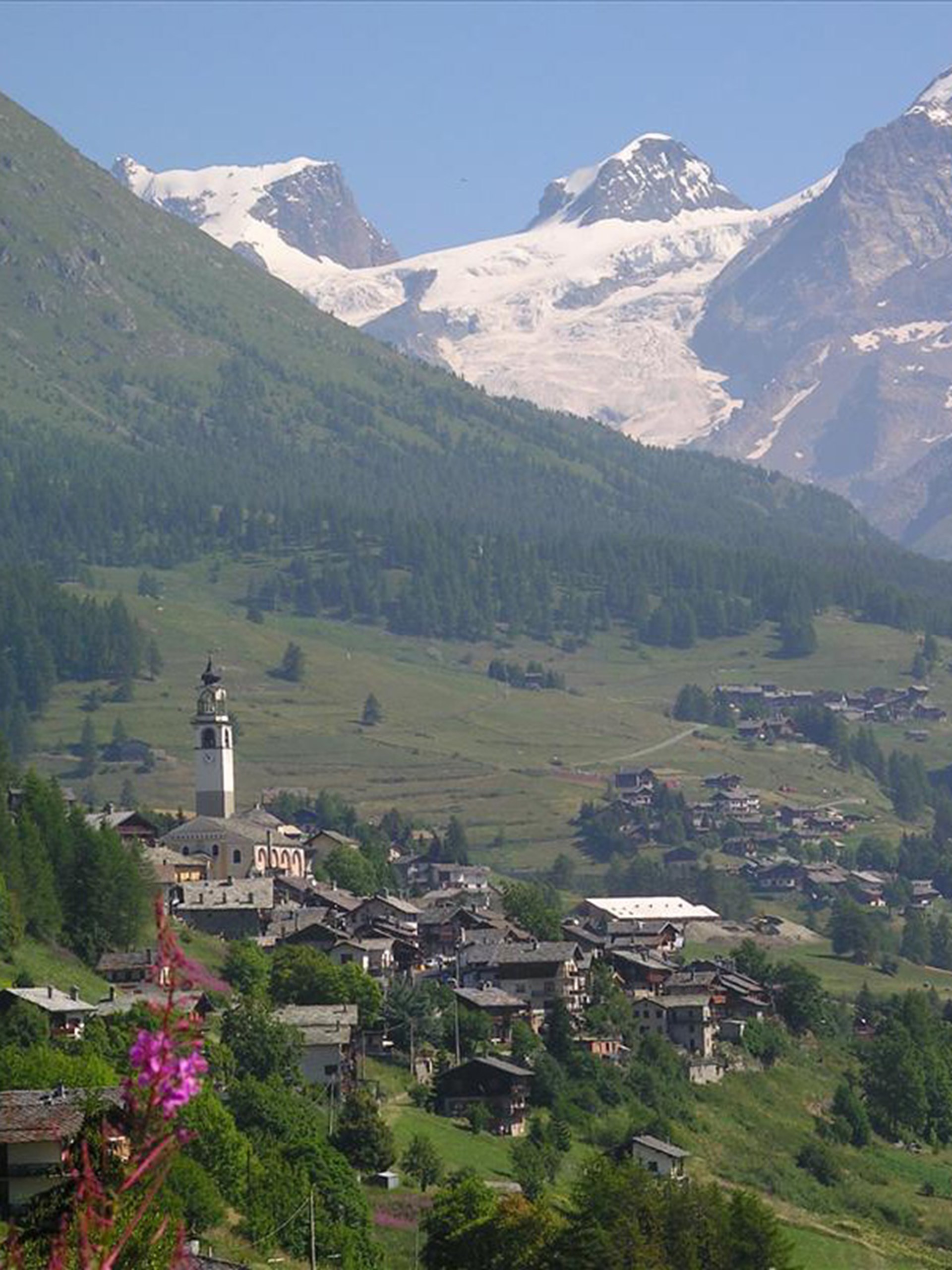 La cappella è di due epoche ben distinte: il presbiterio, con la sua volta e i costoloni, può assegnarsi alla fine del secolo XV - all’epoca del grande mecenate Giorgio di Challant, ed in effetti lo stemma dei Challant che si vede nella chiave di volta lascia supporre che questa famiglia abbia contribuito alla costruzione della cappella - mentre la navata è del secolo XVIII. La cappella è intitolata alla visitazione della Madonna. L’altare maggiore è in legno intagliato, dipinto e in parte dorato. Tra quattro colonne tortili si trovano al centro la statua della Madonna col Bambino, sulla sinistra S. Paolo, a destra Santa Barbara. In alto, nella nicchia centrale, S. Pietro seduto in cattedra.