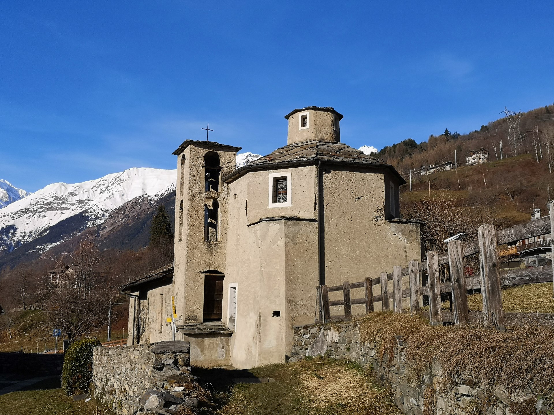 La facciata è completamente affrescata con immagini di San Cristoforo che porta il Bambino Gesù, di San Giovanni Battista e dell’adorazione dei Re Magi.
